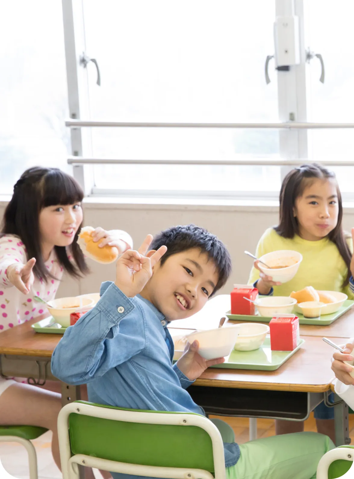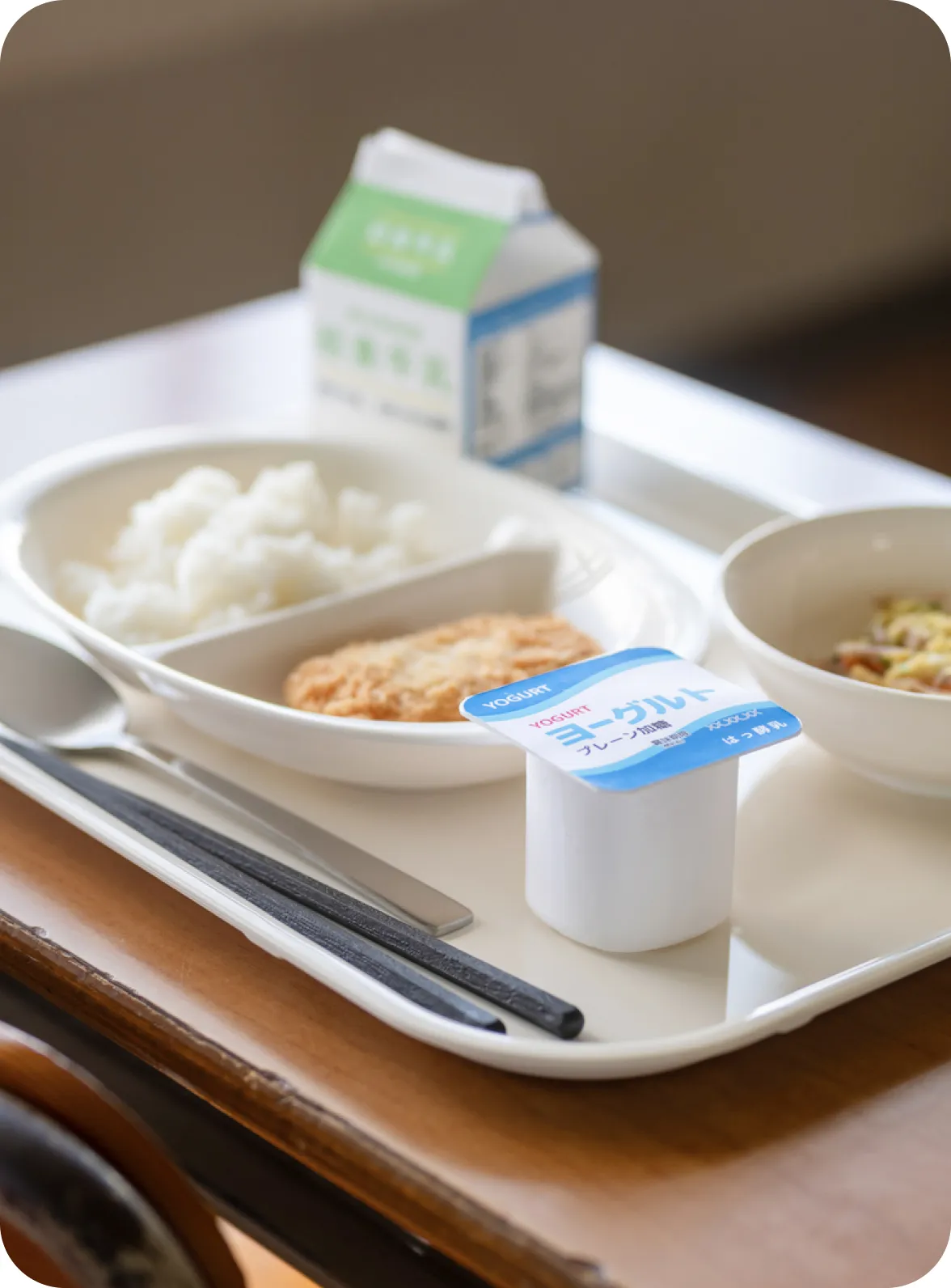 給食前は、配膳室の消毒、仕分け(牛乳、パン、デザートなど)、コンテナの搬入、セッティング、児童へ食器・食缶などの受け渡しを行います。