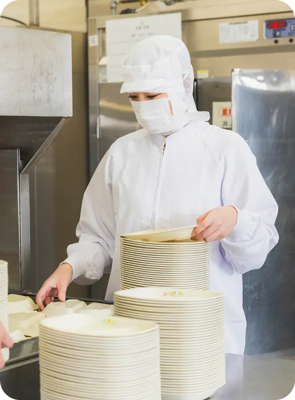 給食後は、食缶の回収補助、内容確認、コンテナの搬出、配膳室の清掃、後片付けなどを行います。